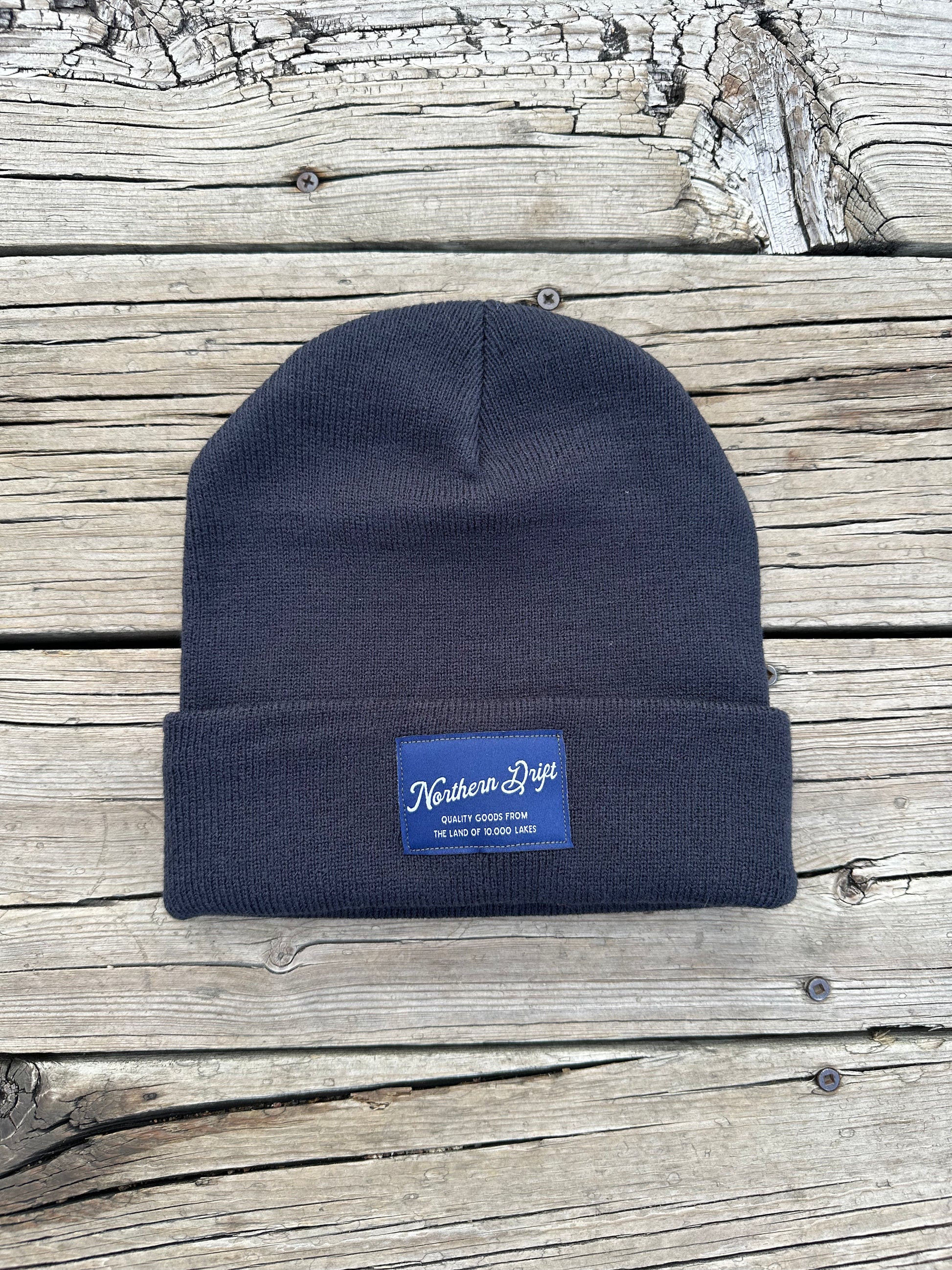 A cozy, knit beanie made in a soft acrylic, with a signature Land of 10,000 Lakes patch detail at the cuff. Navy hat with navy patch and olive green contrast stitching on patch.
