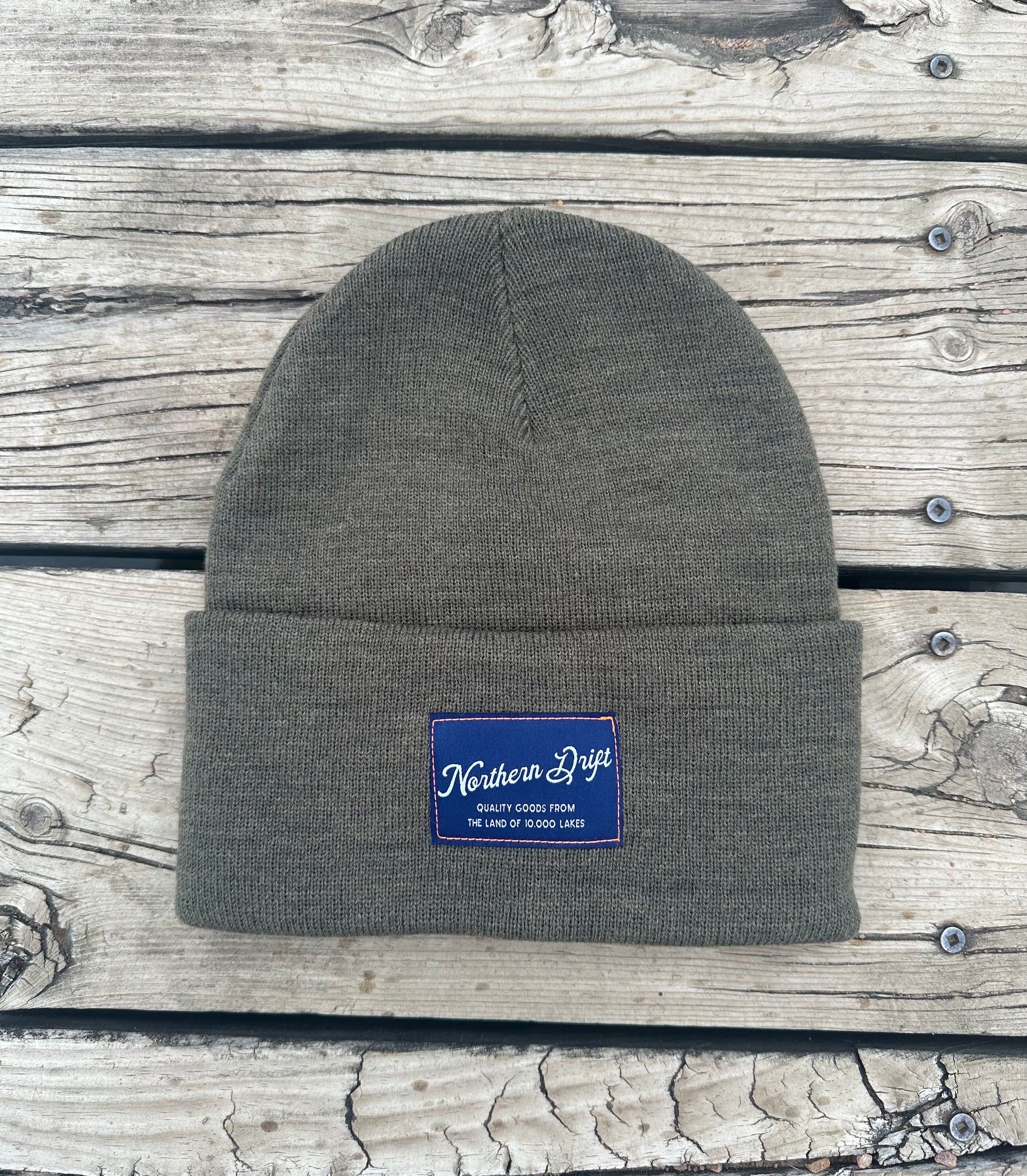 A cozy, knit beanie made in a soft acrylic, with a signature Land of 10,000 Lakes patch detail at the cuff. Olive hat with navy patch and orange contrast stitching on patch.